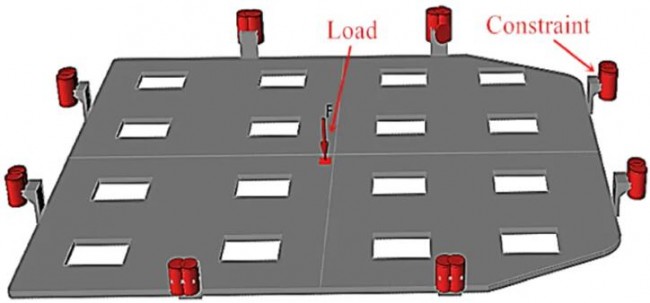 為模擬電池托盤支架在顛簸道路條件下的承載狀況,在托盤底面(Z 軸方向)垂直施加相當于電池重力 5 倍的面載荷。鑒于模型的縮放系數為 0.2,該載荷約為 980 牛。載荷于固定孔處受到約束,將計算速度/精度設置為“更準確”,并選擇工作條件為單載荷條件分析。