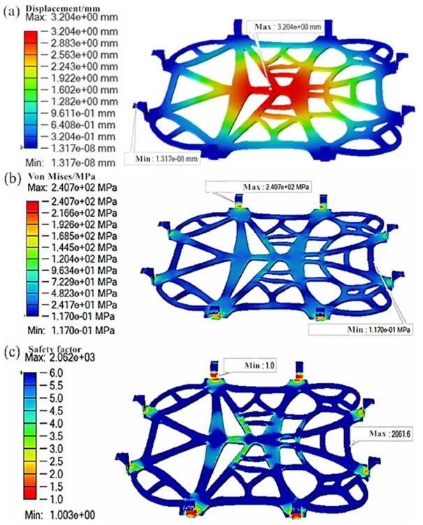 ▲電池載體的受力分析結果:(a)位移云圖;(b)應力云圖;(c)安全系數。