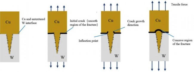 鎢-銅異種金屬斷裂機(jī)理示意圖如圖4所示,縱向拉伸變形時(shí)裂紋起源于未激光織構(gòu)化鎢與增材制造銅的接觸表面,加載力增大后,裂紋進(jìn)一步擴(kuò)展至嵌入鎢內(nèi)部的銅,實(shí)驗(yàn)數(shù)據(jù)表明接頭拉伸斷裂強(qiáng)度接近擴(kuò)散焊接鎢-銅接頭。值得注意的是,互鎖接頭力學(xué)性能可以通過優(yōu)化鎢表面結(jié)構(gòu)以及界面銅增材制造工藝獲得進(jìn)一步提升。